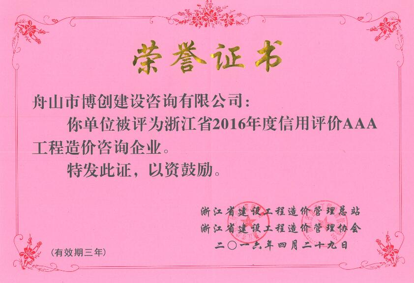 根據(jù)浙江省建設(shè)工程造價(jià)管理總站、浙江省建設(shè)工程造價(jià)管理協(xié)會(huì)聯(lián)合組織開(kāi)展的“2016年度工程造價(jià)咨詢(xún)企業(yè)信用評(píng)價(jià)”結(jié)果顯示,我司再次榮獲2016年度信用評(píng)價(jià)AAA工程造價(jià)咨詢(xún)企業(yè)。